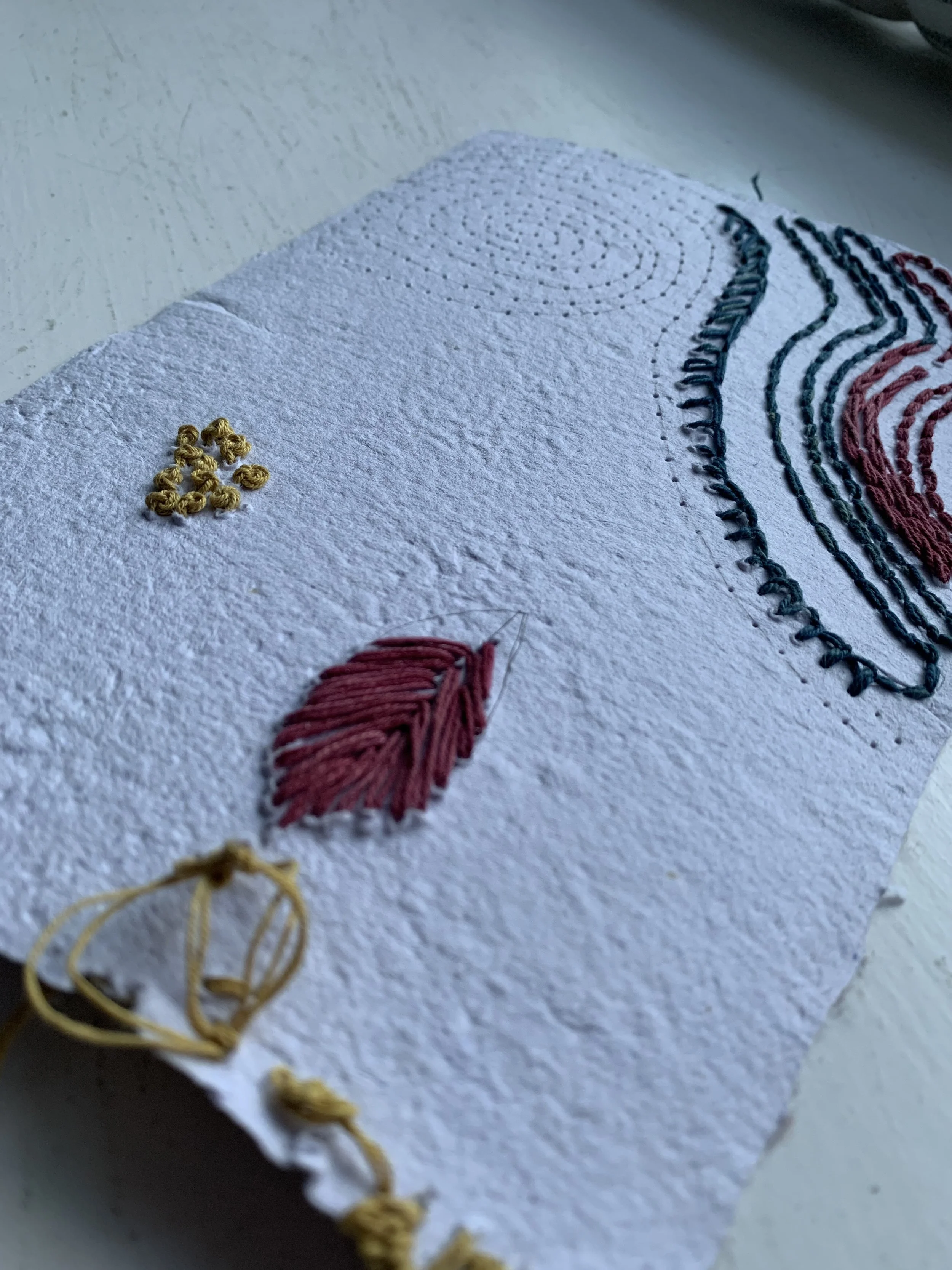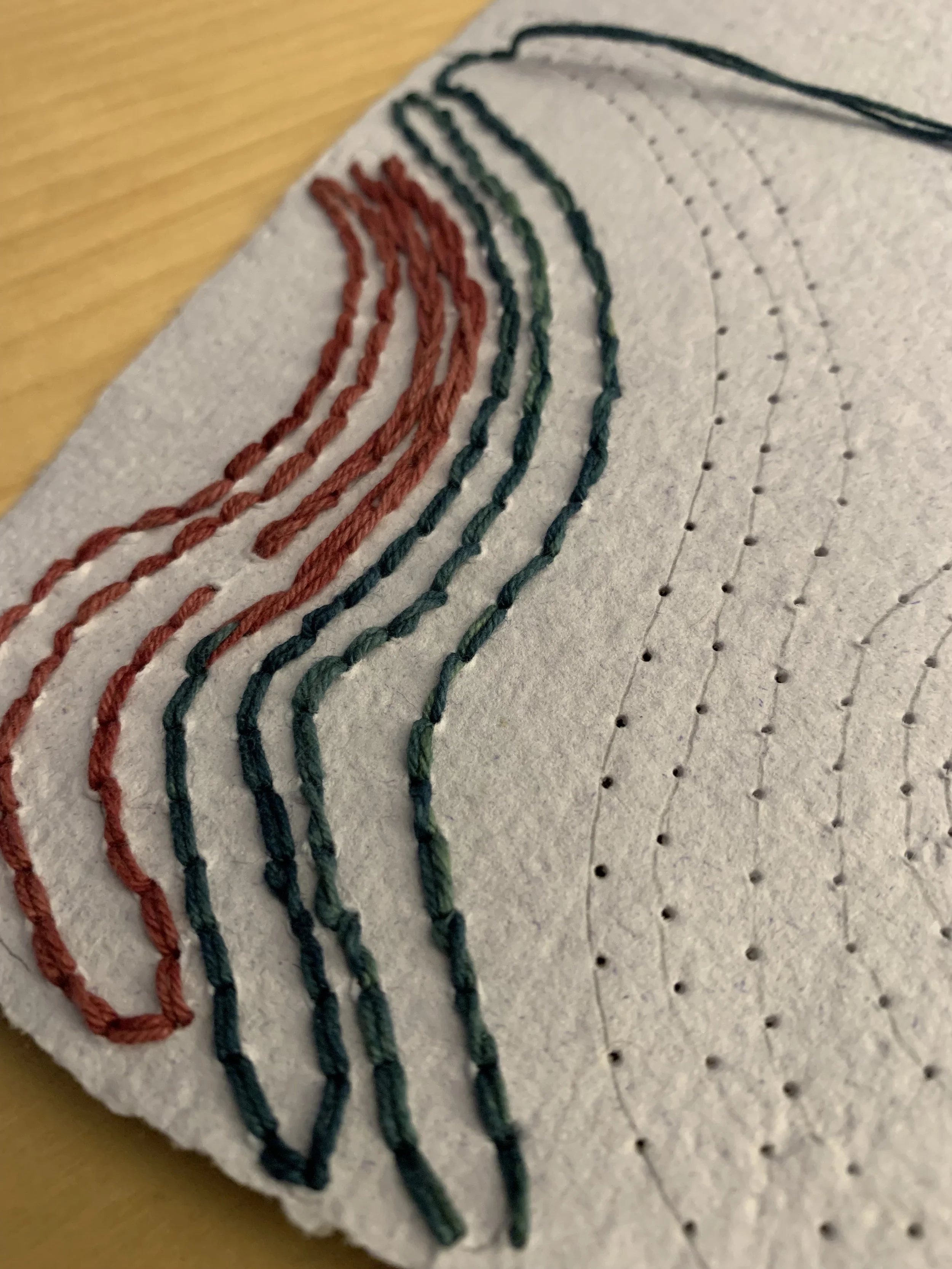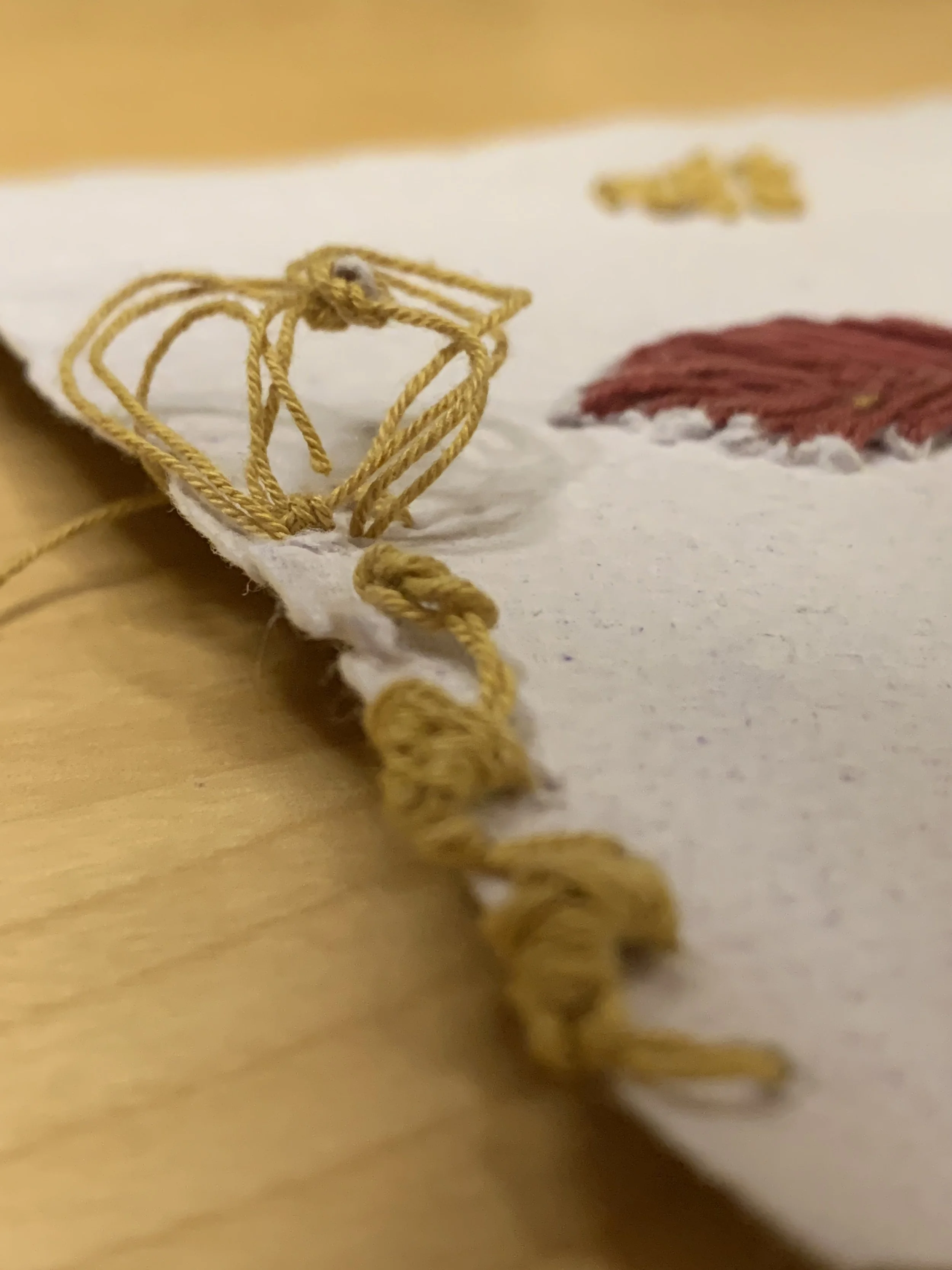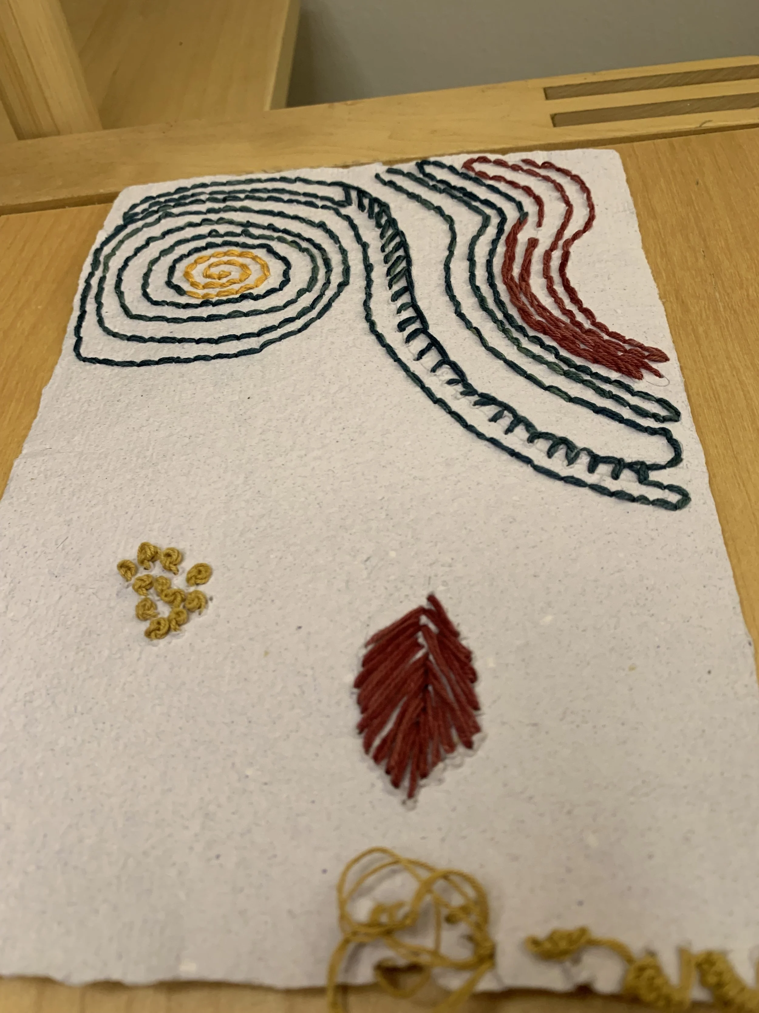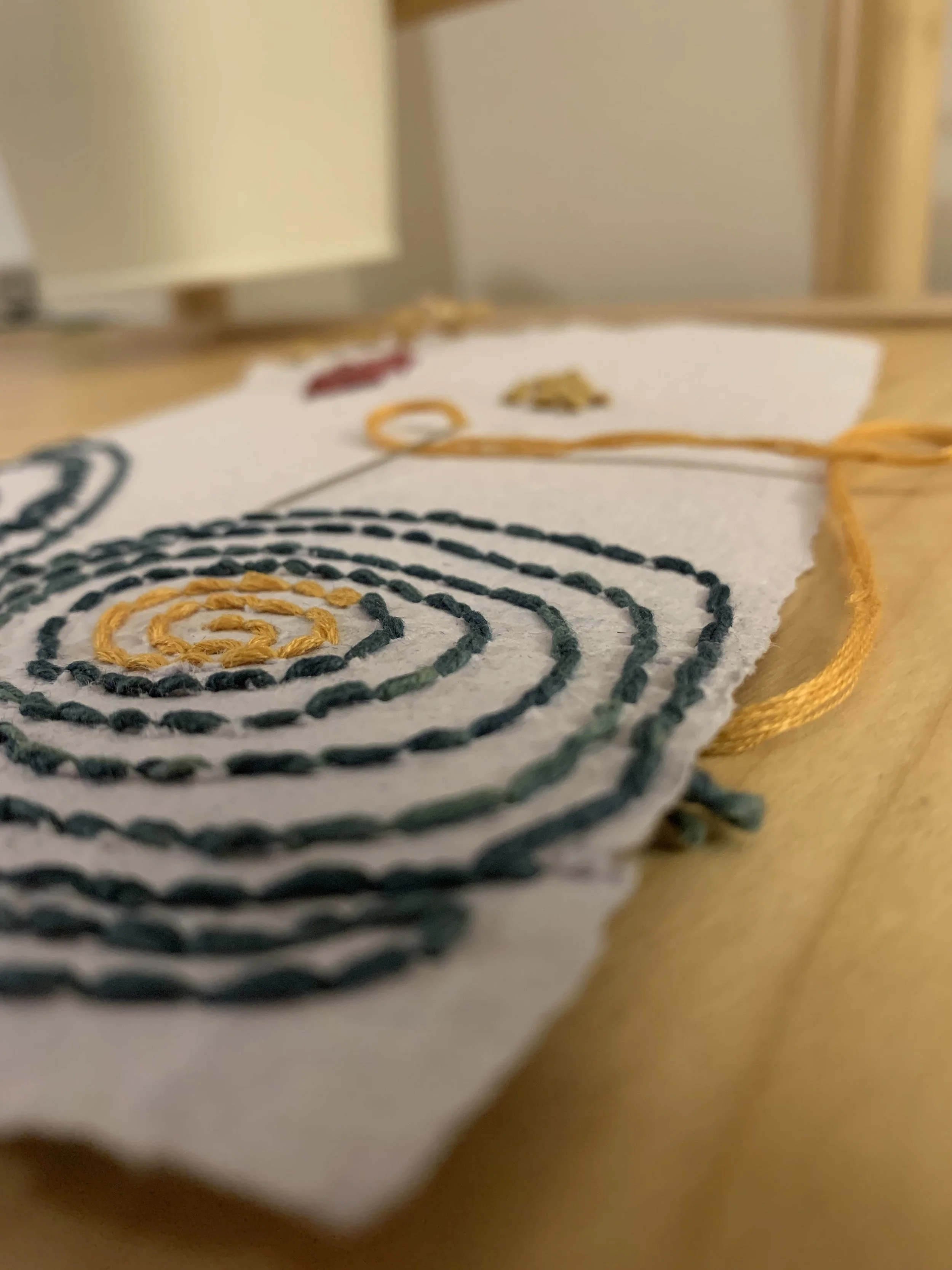 I began with an intuitive stitch, which I now know is referred to as a backstitch. As I was stitching I was struck by the satisfying sound of the thread pulling through the thick textured paper. The thread is naturally dyed giving it a rougher texture than other embroidery thread I’ve used. This texture created some friction causing the thread to catch on itself every now and then, leading to sporadic knots that I needed to gently pull apart with the needle before continuing.