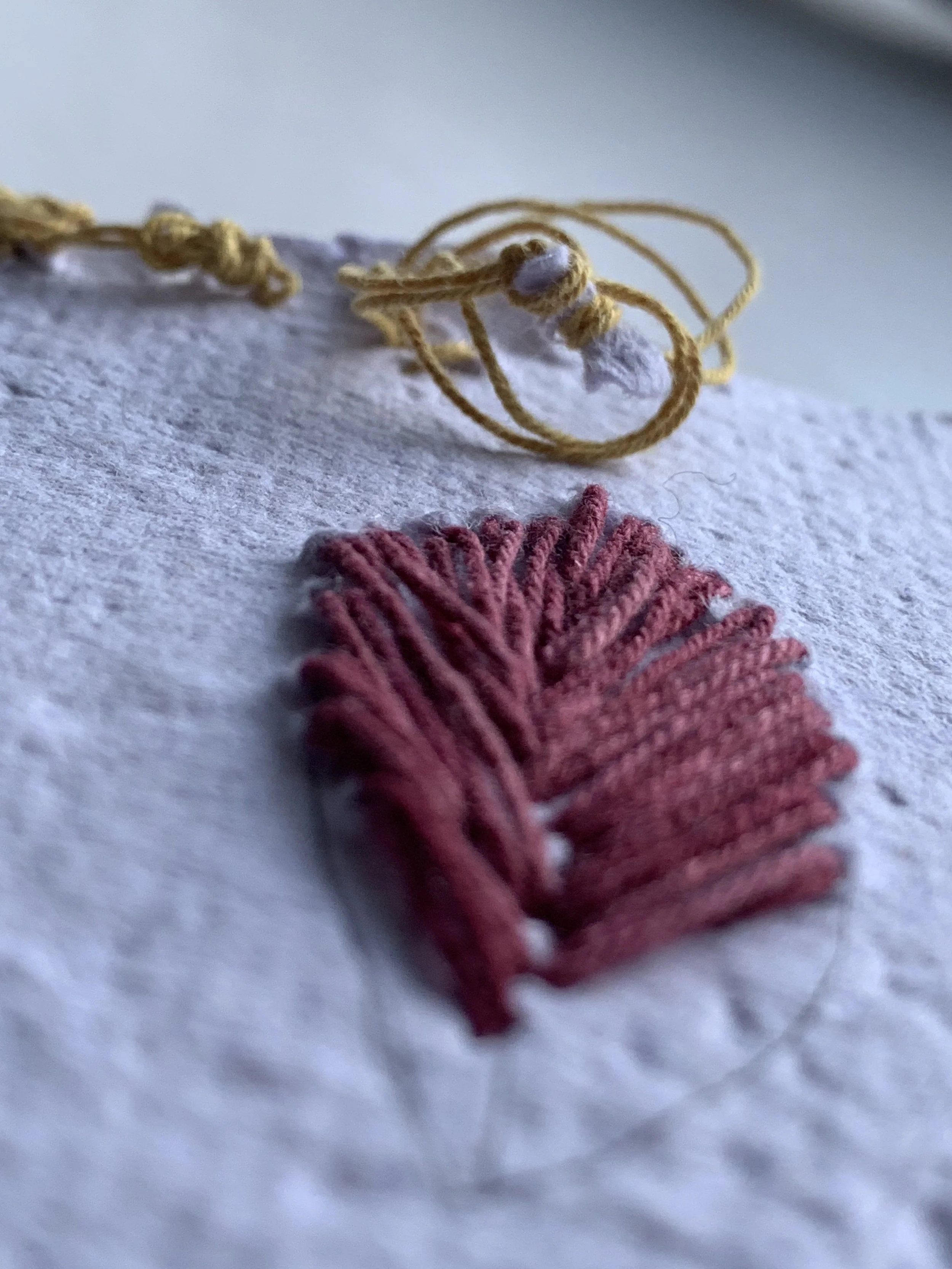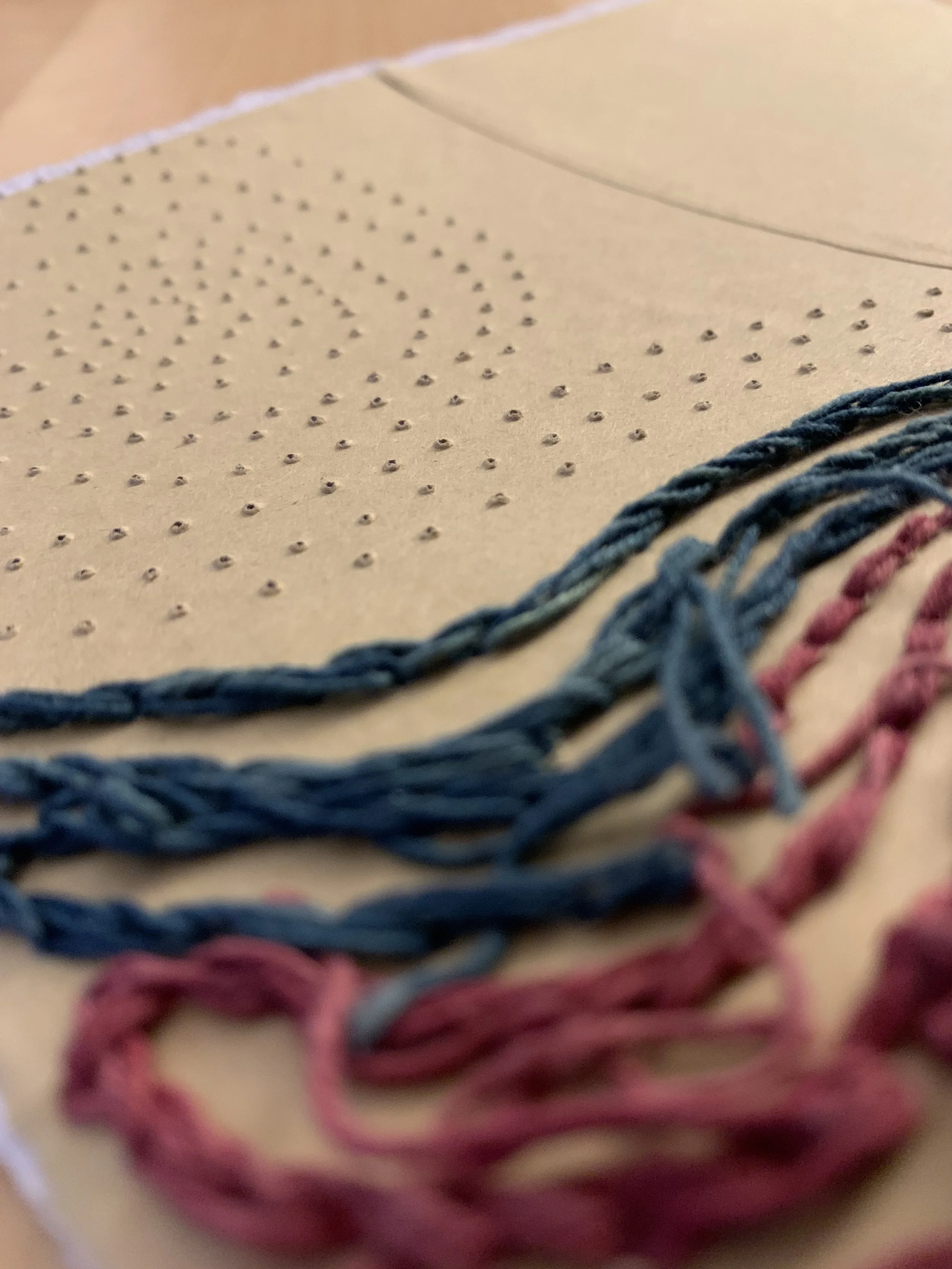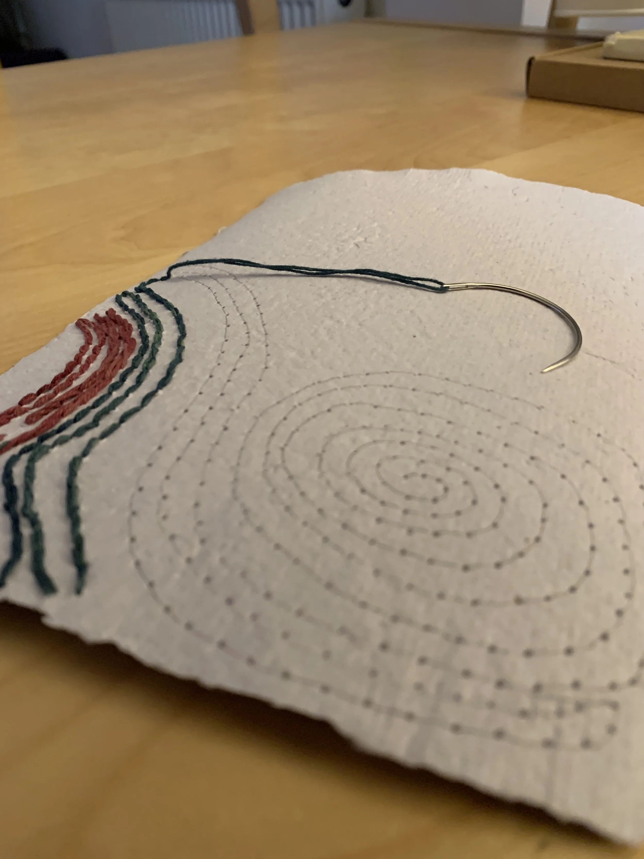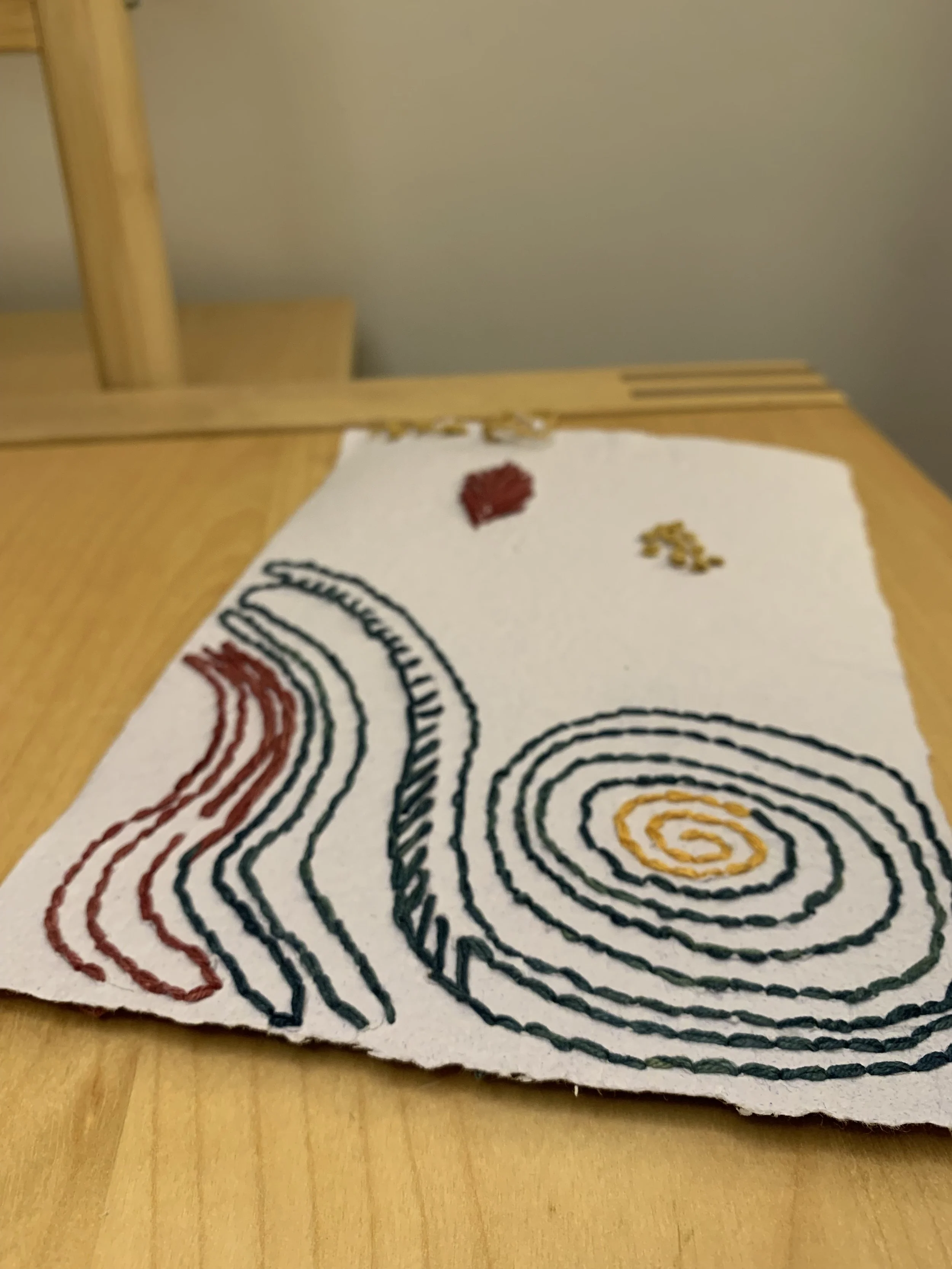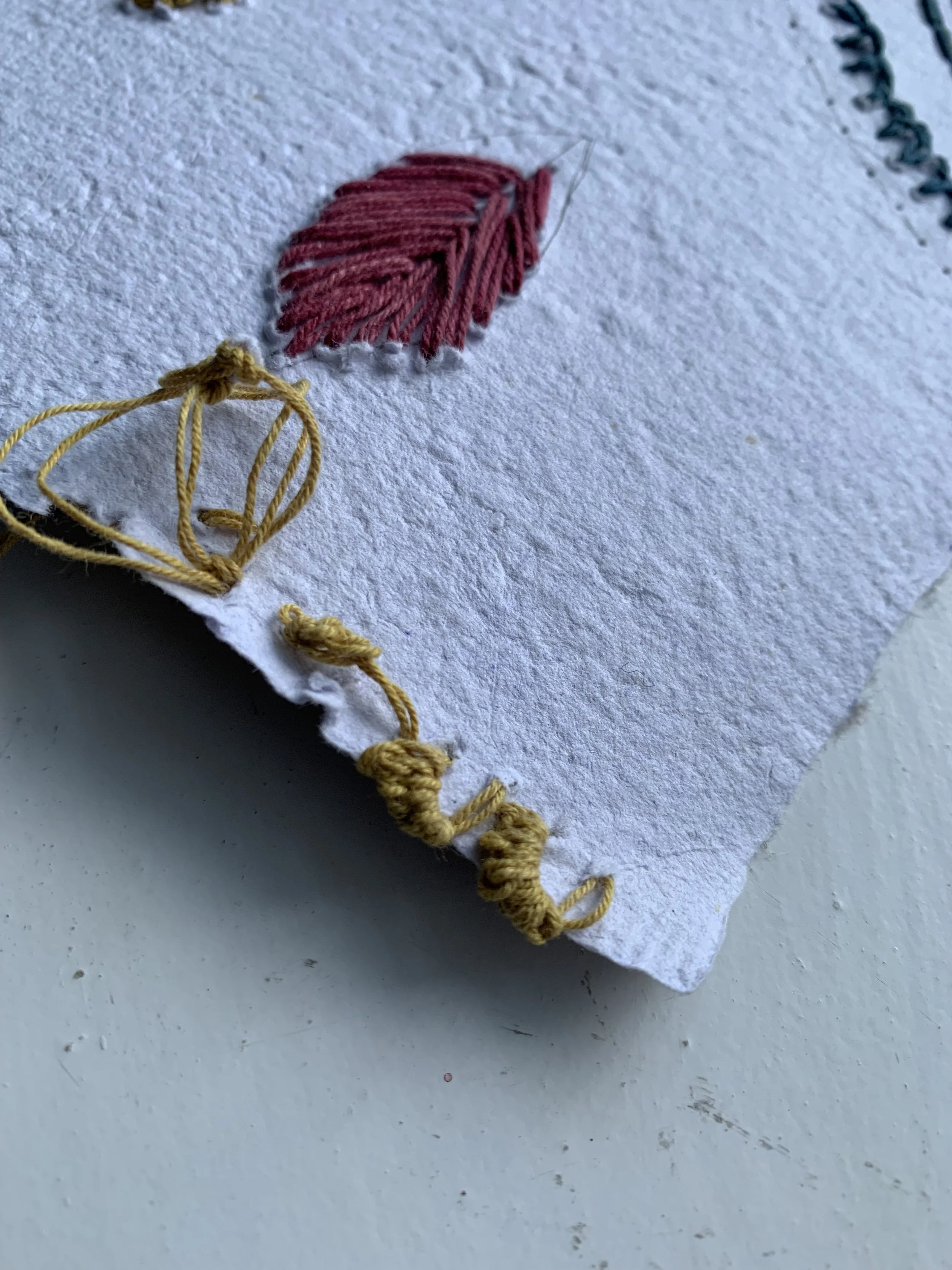 I began with an intuitive stitch, which I now know is referred to as a backstitch. As I was stitching I was struck by the satisfying sound of the thread pulling through the thick textured paper. The thread is naturally dyed giving it a rougher texture than other embroidery thread I’ve used. This texture created some friction causing the thread to catch on itself every now and then, leading to sporadic knots that I needed to gently pull apart with the needle before continuing.