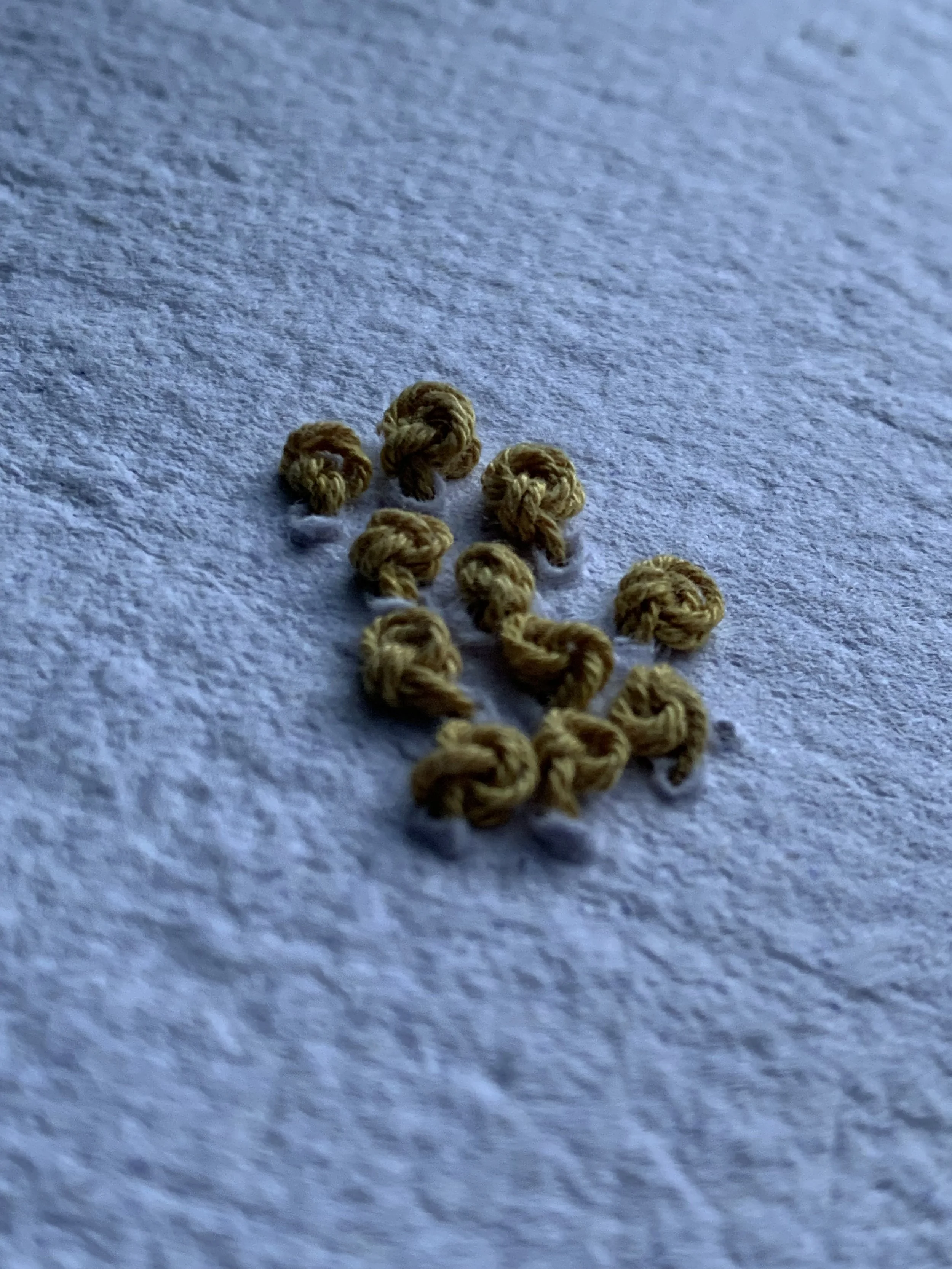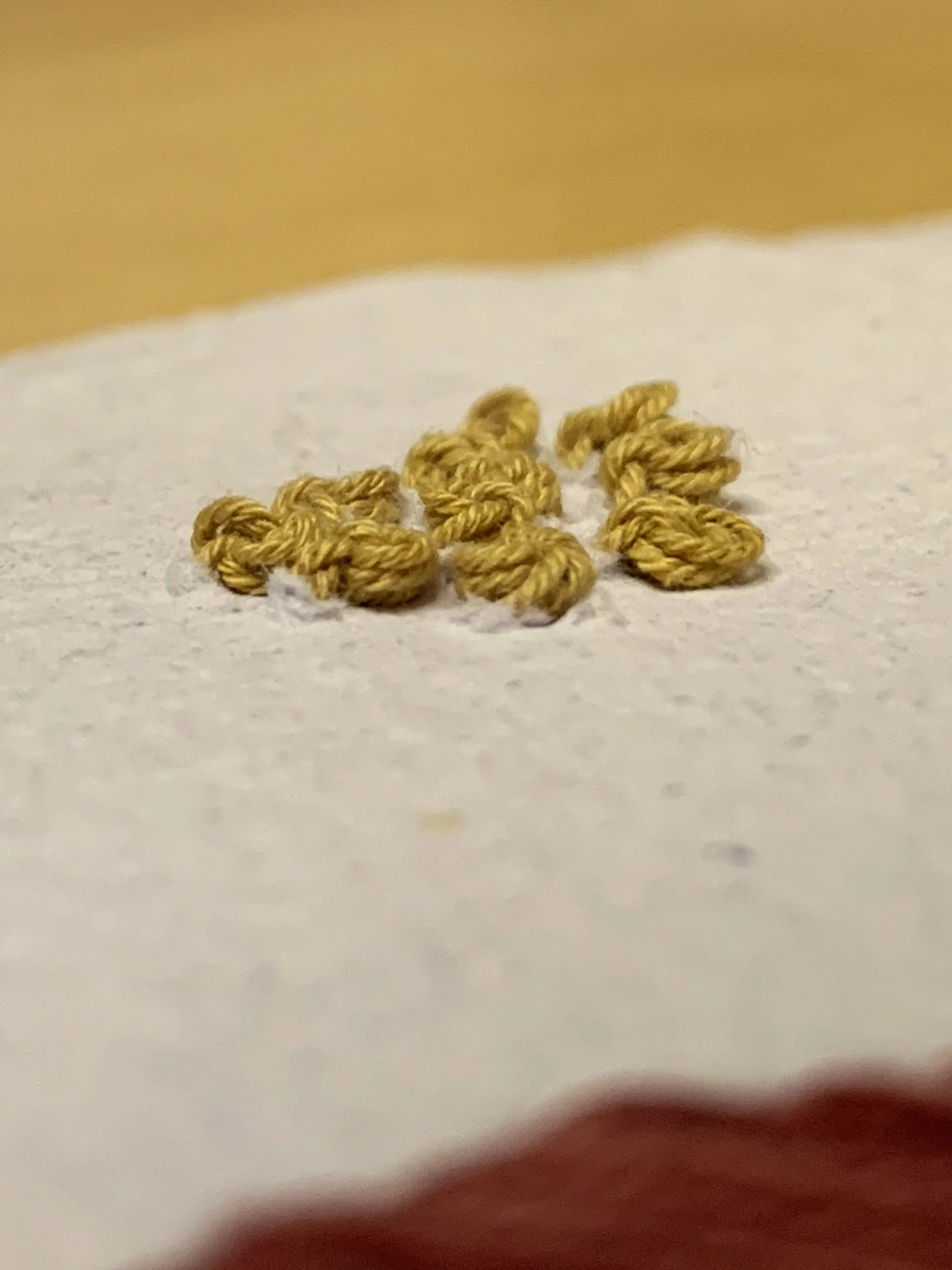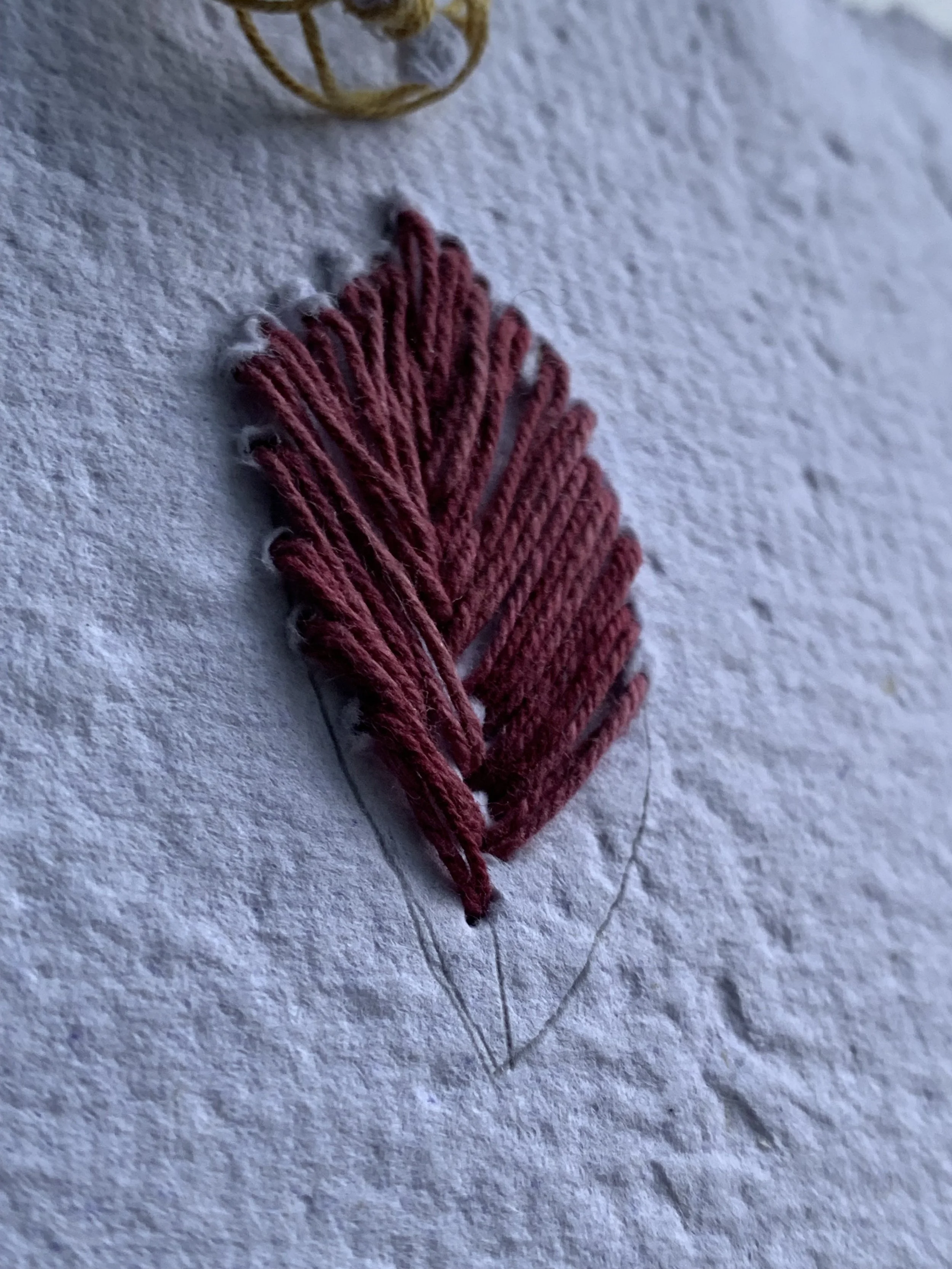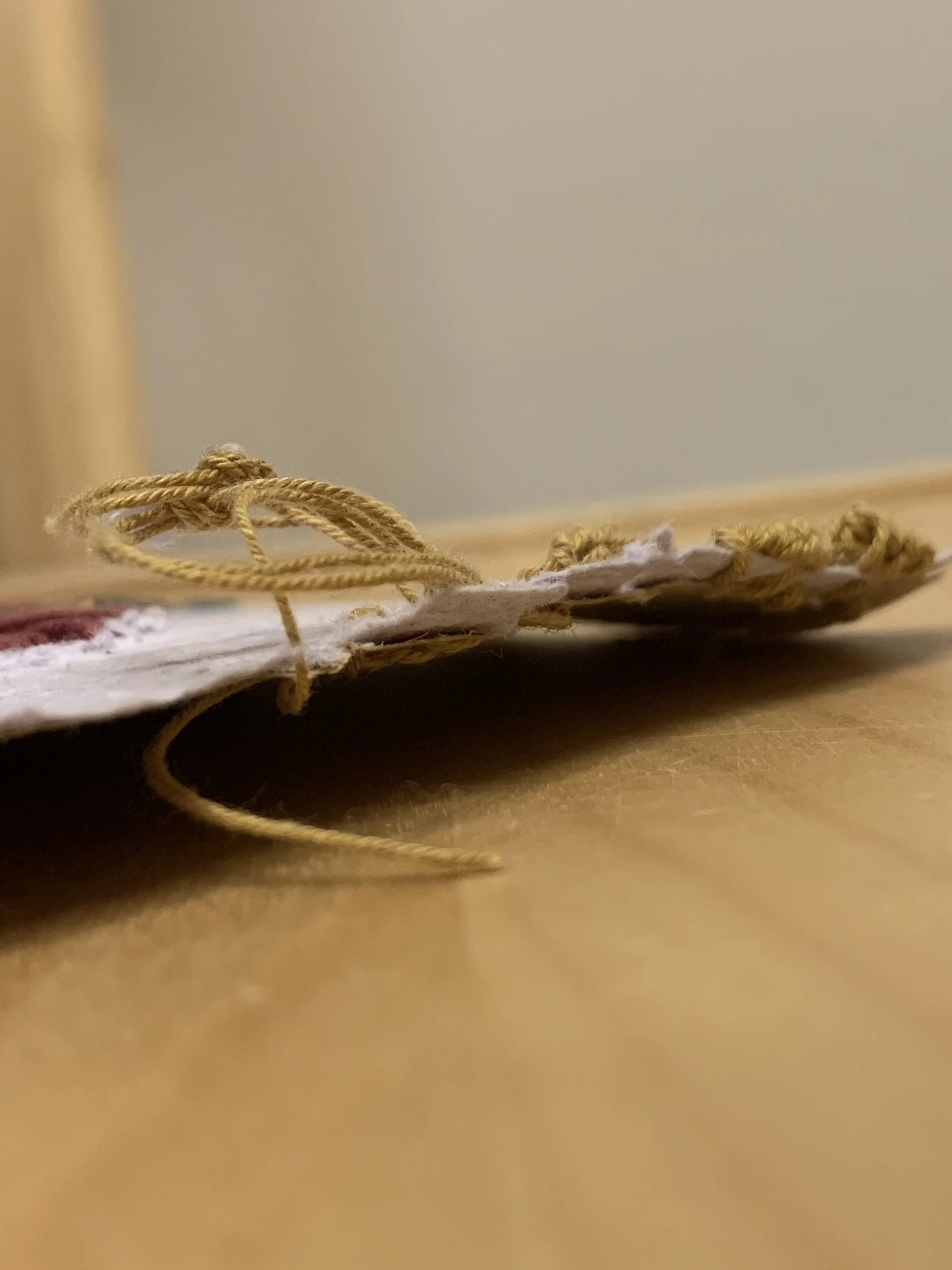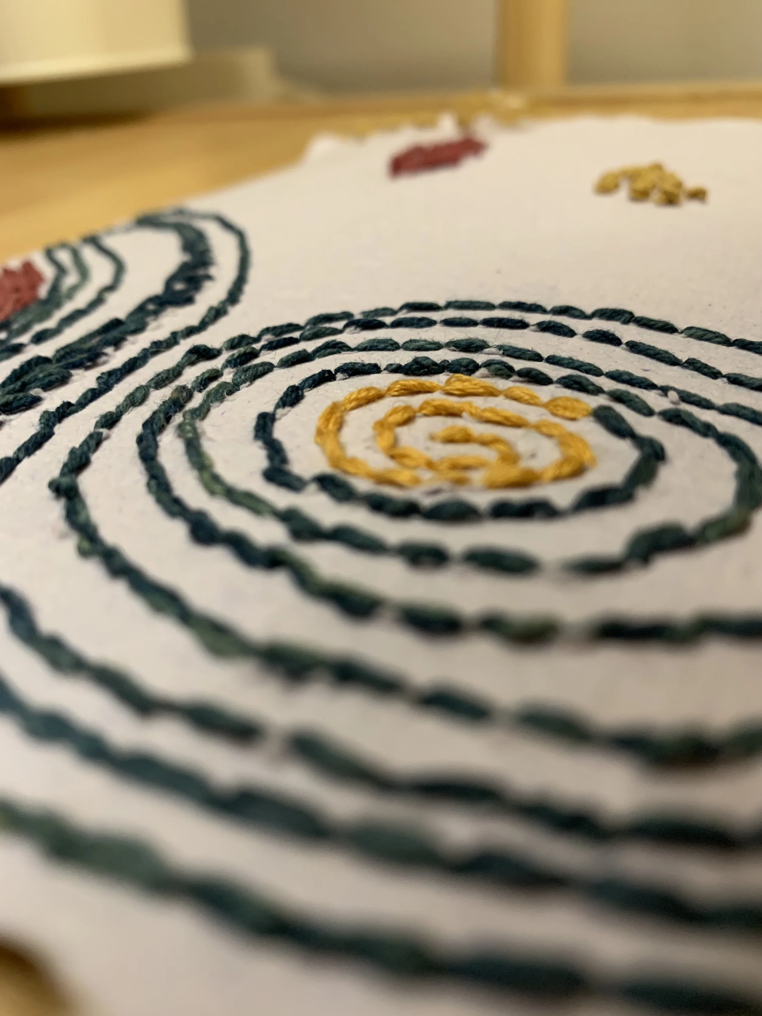 I began with an intuitive stitch, which I now know is referred to as a backstitch. As I was stitching I was struck by the satisfying sound of the thread pulling through the thick textured paper. The thread is naturally dyed giving it a rougher texture than other embroidery thread I’ve used. This texture created some friction causing the thread to catch on itself every now and then, leading to sporadic knots that I needed to gently pull apart with the needle before continuing.